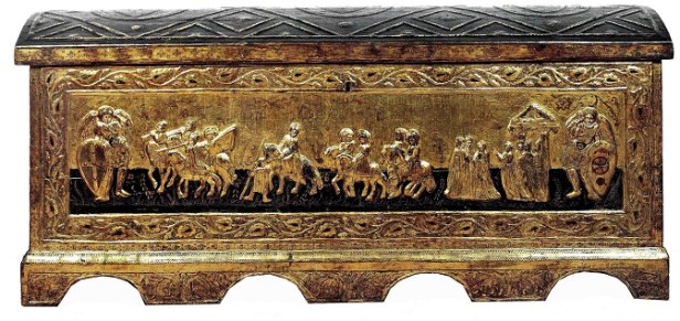 Tra gli oggetti che si potranno ammirare nel castello Della Monica vi sono alcuni pregevoli manufatti legati alla storia e all’arte dell’Abruzzo e del Regno, come il Cassone di legno di pioppo realizzato negli ultimi anni del Quattrocento che presenta un coperchio convesso, frutto di una ricostruzione ottocentesca. L’arredo ligneo è riccamente decorato in pastiglia dorata e dipinta con lo stemma senese della famiglia Piccolomini, importante famiglia che godeva di ampi feudi anche in Abruzzo. Raffinato è poi il piccolo contenitore in rame dorato incastonato di coralli che formano graziose decorazioni vegetali sulla struttura, e a raggera sul coperchio. Il cofanetto, di manifattura siciliana, verosimilmente trapanese, è databile nel Seicento per via della decorazione che in quel secolo è particolarmente diffusa sull’Isola.