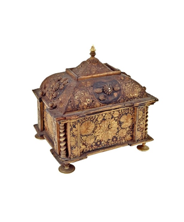 Il percorso espositivo si arricchisce di altri cofanetti preziosi e insoliti che ornano la Camera delle Meraviglie, come quello in legno e avorio con elementi decorativi vegetali e spiraliformi, probabilmente adoperato in ambito liturgico e databile alla metà del XVII secolo, rivestito all’interno con carta rossa decorata con motivi vegetali e animali impressi in oro.