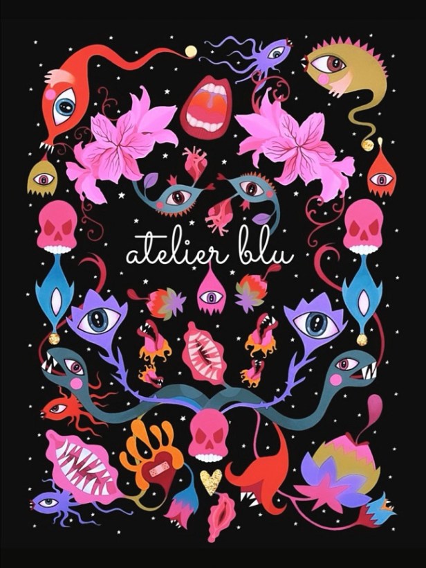 Buongiorno! Lei ha scelto quale suo manifesto – e altresì per il suo Atelier Blu – la vagina incoronata come simbolo di energia, femminilità e ardore. Si dice poi che codesto cuore sacro protegga e illumini coloro ai quali viene donato e sia portatore di erotismo, fertilità, allegria. Tale suo identificativo ha origine da un occorso e da un ben preciso pensiero e ideale, da una qualche tenace speranza? “Buongiorno Giulia! Spesso accade che io segua un istinto, una piccola intuizione e che questa si riveli più importante, per il mio percorso, di quanto credessi in origine. La vagina incoronata è un estratto di ‘The Crown’ [clicca qui per vedere l’opera originale], da me dipinto durante i primi giorni di lockdown ossia a marzo 2020. Il cuore – che ora rappresenta il mio Atelier Blu – abita perfettamente al centro proprio del dipinto e mi sono accorta, nel tempo, che ne riassume perfettamente la natura. In quei giorni confusi e di spavento, misi sul cavalletto una grande tela e iniziai a tracciare disegni che liberassero la paura e la trasferissero fuori da me. Dipingere è il mio modo di esorcizzare il dolore. Poter guardare ciò che mi spaventa, dargli una forma, mi aiuta a pensare… a capire, ad accettare. La vagina è un simbolo che amo molto. Ho sempre rappresentato la femminilità, la fertilità, il potere del concepimento come origine e motore del mondo… sarà perché, per tanti anni, avrei voluto essere nata maschio a causa di un certo piglio ribelle e scomposto che mi porto dietro dall’infanzia. Durante l’adolescenza ho sofferto la mia femminilità, arrivando a rinnegarla. Quando infine ho accettato la mia natura, mi sono innamorata dell’essere donna. È stata una maturazione travagliata ma bellissima, originata da una profonda consapevolezza e da un pensiero elaborato attraverso l’esperienza fatta e i libri che ho letto, la musica che ho scelto, la storia che ho studiato. Adesso che sono adulta e madre, celebro la femminilità nei miei quadri in quanto penso che non venga mai fatto abbastanza. Le donne hanno ancora moltissima strada da percorrere per essere riconosciute come grembo perfetto e miracoloso dell’umanità. Donne instancabilmente rivolte al proprio cuore e tenacemente in difesa del proprio cervello, capaci di un’alchimia tra sangue e mente che andrebbe riconosciuta e protetta nonché sostenuta come patrimonio universale. L’erotismo e l’allegria sono quanto auguro a tutte le donne che amo e che, nella vita, mi tengo vicine. Il cuore sacro è appunto un simbolo potentissimo di protezione e, benché il mio sia poco sacro, è però pieno d’amore”.
