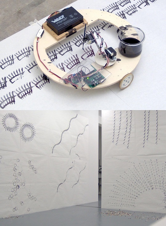 “Interpreto questo mio intervento – dichiara l’artista – come una collaborazione con il laboratorio, non solo per il piacere di incontrare (e fare incontrare) materiali interessanti, la cui presenza è tanto casuale quanto temporanea, ma anche per organizzare una sorta di esposizione dei suddetti materiali selezionati assieme a lavori miei, pertinenti. Due anni fa ho fatto una cosa del genere, con differenti modalità, allo CSAC di Parma. Quasi tutti i lavori in mostra sono molto collegati con l’idea di guardare il formarsi dei lavori, limitando l’intervento dell’”artista” ad una forma accompagnatoria del divenire. La differenza tra il 2007, quando realizzammo i primi disegni per feste con una macchina che dipinge con pennello ed inchiostro ed oggi è che nel frattempo abbiamo maturato la convinzione (come ci dice la scienza) che la nostra presenza influenza la realtà”.