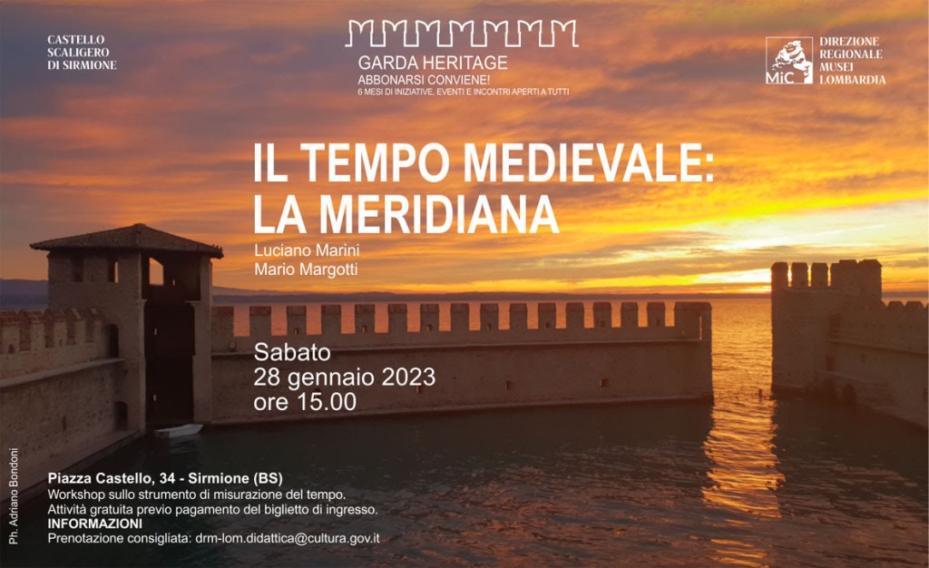 Per tutti gli appassionati, l’appuntamento è fissato per sabato 28 gennaio, con inizio alle ore 15.00 (legali e non solari, a proposito di meridiane), al Castello Scaligero di Sirmione (BS) con “IL TEMPO MEDIEVALE: LA MERIDIANA”.