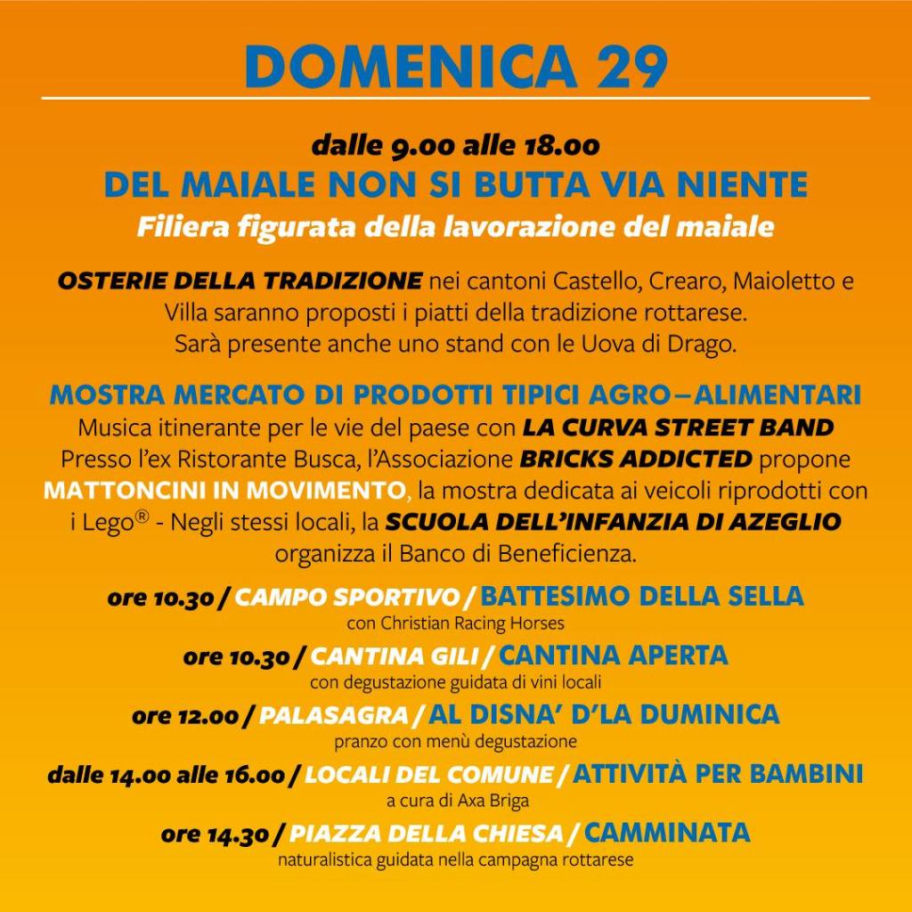 Domenica 29 gennaio dalle 9 alle 18 è in programma l’evento “Del maiale non si butta via niente”, con la filiera figurata della lavorazione del maiale. Le osterie della tradizione propongono i menù degustazione nei cantoni Castello, Crearo, Maioletto e Villa, mentre in uno stand è possibile trovare le artistiche Uova di Drago.