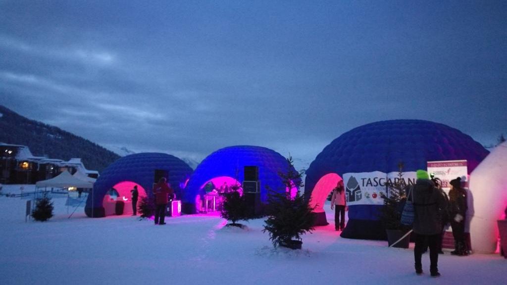 Lo ski village si riconosce facilmente dagli igloo gonfiabili dove si raccolgono le iscrizioni e dove si trova il palco e dalla musica di Radio DEEJAY.