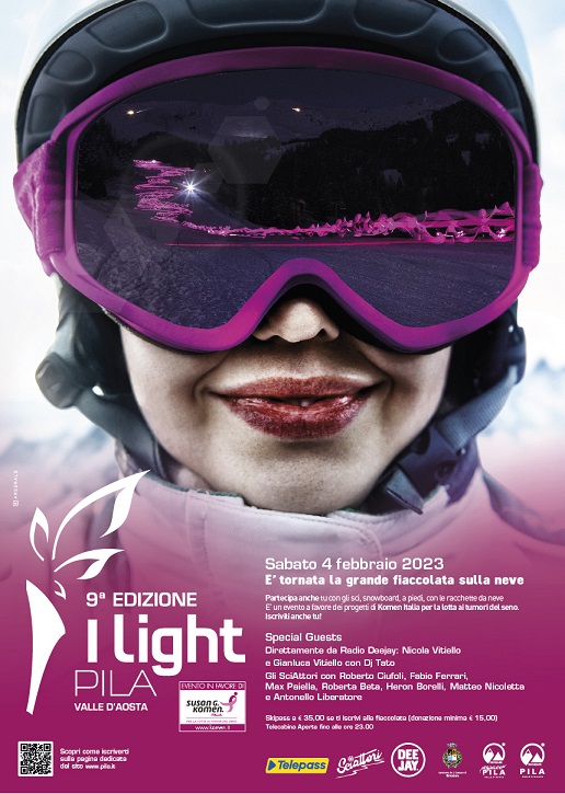 È possibile anche una donazione di chi non può o non vuole sciare, ma vuole partecipare col proprio contributo. Iscrizione/donazione: presso la biglietteria della funivia Aosta-Pila, presso il village sabato 4 febbraio, online sul sito di Pila I Light Pila – Pila, online direttamente sul sito dell’Associazione: https://www.komen.it/iniziative/i-light-pila
