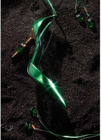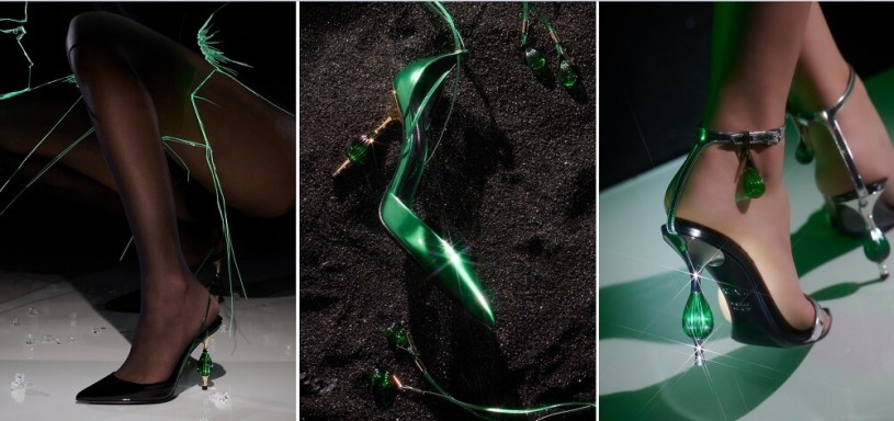 Caratterizzato da un’iridescenza sfaccettata, lo spark assume forme diverse per ogni modello, da gioiello che accarezza la caviglia a tacco scultoreo, diventando espressione della storia di chi lo indossa, come una creazione di alta gioielleria.