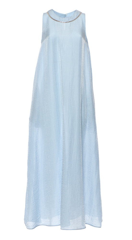 Si porta sopra camicie e piccoli top, ma per assomigliare a una principessa al ballo Rocco Ragni suggerisce di infilarlo sopra un lungo abito in viscosa resa cangiante dalla bacchetta magica di una fatina. Senza maniche, scende con ampiezza a trapezio fino al malleolo ed è percorso, lungo lo scollo, da un sottile inserto metallico, naturalmente nickel free.