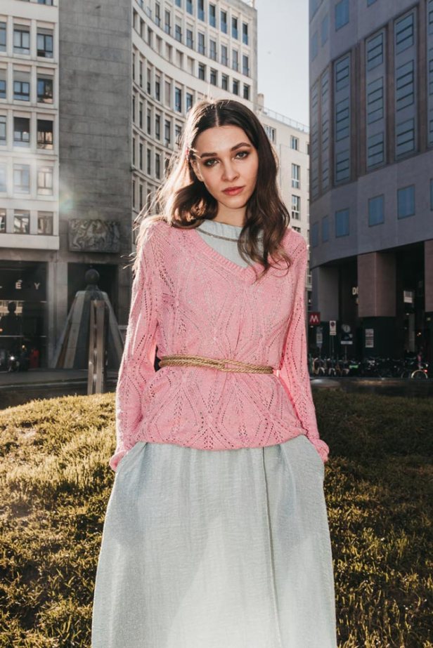 Così, le mani sapienti degli artigiani che dal 2005 animano la sua Bottega Perugina nel borgo di Compresso (PG) hanno plasmato il pull a V con losanghe traforate. È realizzato in un morbido filato di viscosa intessuto di fibra metallica, che lo illumina di scintillii improvvisi mentre una piccola percentuale di Elastan lo rende ancora più confortevole nella vestibilità e indeformabile nel tempo.