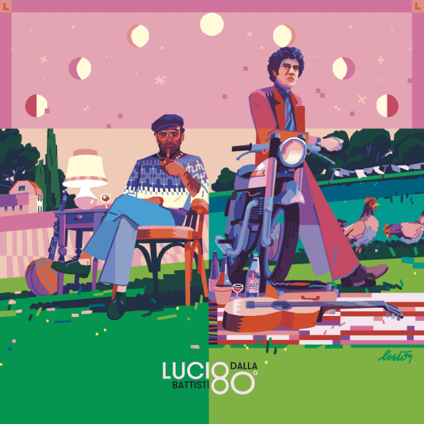 “Lavorare all’illustrazione per l’ottantesimo anniversario della nascita di Battisti e Dalla – racconta Matteo Berton – è stata una grande opportunità per riscoprire il legame che ho con queste due icone della musica italiana. Ognuno di noi ha sicuramente un ricordo legato ad una delle loro canzoni, per me erano diversi, il più vecchio forse è quello di mamma e suoi dischi di Battisti ma anche la prima volta che ho sentito com’è profondo il mare e le nottate passate a suonare le loro canzoni alla chitarra. Ho voluto lavorare ad una composizione allegorica, quasi rinascimentale, i due posano in mezzo ai campi e le galline in un contesto popolare lontano dai luoghi della celebrità. In terra una coperta e la natura morta di un pic nic e sparsi nell’immagine degli easter egg e riferimenti alle loro canzoni”.