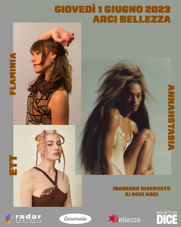 RADAR Concerti presenta Annahstasia la cantautrice americana, torna in Italia, dopo aver aperto i concerti di Lenny Kravitz a Milano e Bologna nel 2019, per una data tutta al femminile insieme a ETT e Flaminia che si terrà il 1 giugno 2023 all’Arci Bellezza di Milano in collaborazione con Caramello. I biglietti sono disponibili solo sulla piattaforma di ticketing e discrovery DICE. Annahstasia è considerata una degli astri nascenti del nu soul americano, dalla voce sontuosa e sensibile ispirata alle grandi artiste d’oltreoceano, da Janis Joplin e Nina Simone, come racconta lei stessa. L’artista torna in Italia per una data esclusiva, ad accompagnarla saranno ETT, giovane cantautrice dream pop contaminato da elementi sonori raccolti dai lunghi anni trascorsi all’estero, e dall’elettro pop di Flaminia, tra sperimentazione musicale ed elettronica di matrice francese. Quando Annahstasia scrive una canzone, questa incarna un mondo a sé stante. La cantautrice afferma che la sua pratica artistica è intrisa di fantasia e romanticismo e la prospettiva rosea di Annahstasia prende vita dalla sua voce incantevolmente sontuosa e acrobatica che ha sviluppato grazie a un apprezzamento per artisti come Bill Withers, Nina Simone e Janis Joplin. “Sono stati i primi musicisti che ho sentito prestare la loro voce alla loro musica e non la musica alla loro voce“, spiega. Durante il processo creativo preferisce immaginare gli spiriti che vivono nelle sue canzoni, come potrebbero apparire, muoversi, parlare o ballare, e parlare delle loro identità in tempo reale attraverso la sua musica. Il suo primo disco da solista “Sacred Bull” del 2019, è stato un esperimento onesto e senza fronzoli che le ha aperto le porte a collaborazioni con artisti del calibro della cantante Raveena, presente nel suo nuovo disco, e di Lenny Kravitz, che l’ha invitata a supportarlo come opener nel suo tour europeo “Raise Vibrations”. Ora, la splendida voce di Annahstasia è il filo conduttore del suo prossimo disco dalle radici folk, Revival, un progetto delicatamente prodotto che ha rinnovato il suo amore per la musica dopo un periodo di incertezza e ha facilitato una potente rinascita di sé. ETT è il progetto di Gaya Misrachi, giovane cantautrice triestina di origine greca, inizia a muovere i primi passi nella musica da giovanissima. Lo stile del progetto è improntato sul genere dream pop, contaminato nel sound da elementi sonori raccolti dai suoi lunghi trascorsi all’estero. L’artista oltre che ad esporre il suo mondo in musica si racconta attraverso i suoi dipinti ed artwork, rendendo il tutto più interpretabile e coinvolgente per coloro che l’ascoltano. Nell’autunno 2021 entra a far parte del roster di ISLAND (Universal Music Italia). Flaminia, nata da una famiglia di musicisti, fin da piccola mostra interesse verso la musica e il canto. Dopo aver trascorso gli anni dell’adolescenza nell’ambito della musica classica, comincia a dedicarsi a produzioni inedite con un occhio rivolto alla musica pop elettronica. L’estate del 2018, a Nashville e New York, collabora ad alcune produzioni in studio e scrive l’Ep “Lotus” uscito a Novembre del 2020. Con i primi due singoli viene selezionata artista JustDiscovered da Mtv New Generation e inserita nella playlist del programma di Alessio Bertallot “Casa Bertallot” mentre il magazine online DLSO presenta in anteprima il video di “HLNG”. Nella primavera del 2022 esce “KOMOREBI”, il suo primo EP in italiano. Un viaggio musicale e personale attraverso canzoni che richiamano paesaggi nordici e intimi, definito da sonorità elettroniche, con riferimenti alla scuola francese e a mondi più sperimentali. I brani hanno ricevuto molta attenzione da parte del pubblico e addetti ai lavori e sono stati inseriti, tra le altre playlist, su Fresh Finds Italia, Alessio Bertallot Selecta, Anima R&B e New Music Friday. È in programma l’uscita di un nuovo EP a maggio 2023, anticipato dalla release di alcuni singoli che confermano la cifra pop elettronica del progetto, con uno sguardo a sonorità più industriali tra suoni metallici e taglienti.