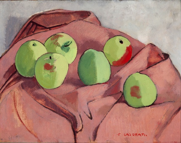 Nel celeberrimo dipinto Silvana Cenni del 1922, esplicito omaggio a Piero della Francesca, una silente immobilità permea ogni cosa, congelando la figura e la scena in un fermo immagine misterioso; tutto è aderente al vero, nei più minuti dettagli, ma talmente realistico da tradursi in straniamento. I quadri con figura sono intercalati in mostra da alcuni paesaggi e da un nucleo di nature morte, fra le quali quelle dedicate alle uova, emblema araldico dell’arte casoratiana. Queste forme perfette e dalla fragile consistenza permettono all’artista una riflessione sul contrasto tra la precarietà e la solidità, oltre a un ulteriore rimando a Piero ma anche a Cézanne.