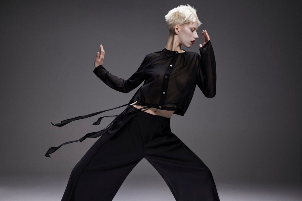 La silhouette è alta, slanciata, verticalizzata da studi – come il posizionamento nelle tasche dei pantaloni asciutti e longilinei, che invita a una postura diritta, a testa alta.