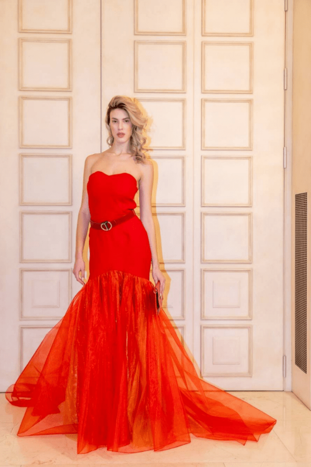 In quest’ultimo evento sono stati molto apprezzati due abiti da gala rossi, eleganti e raffinati con dettagli in tulle che ricordano molto lo stile principesco e le Dive del Cinema.
