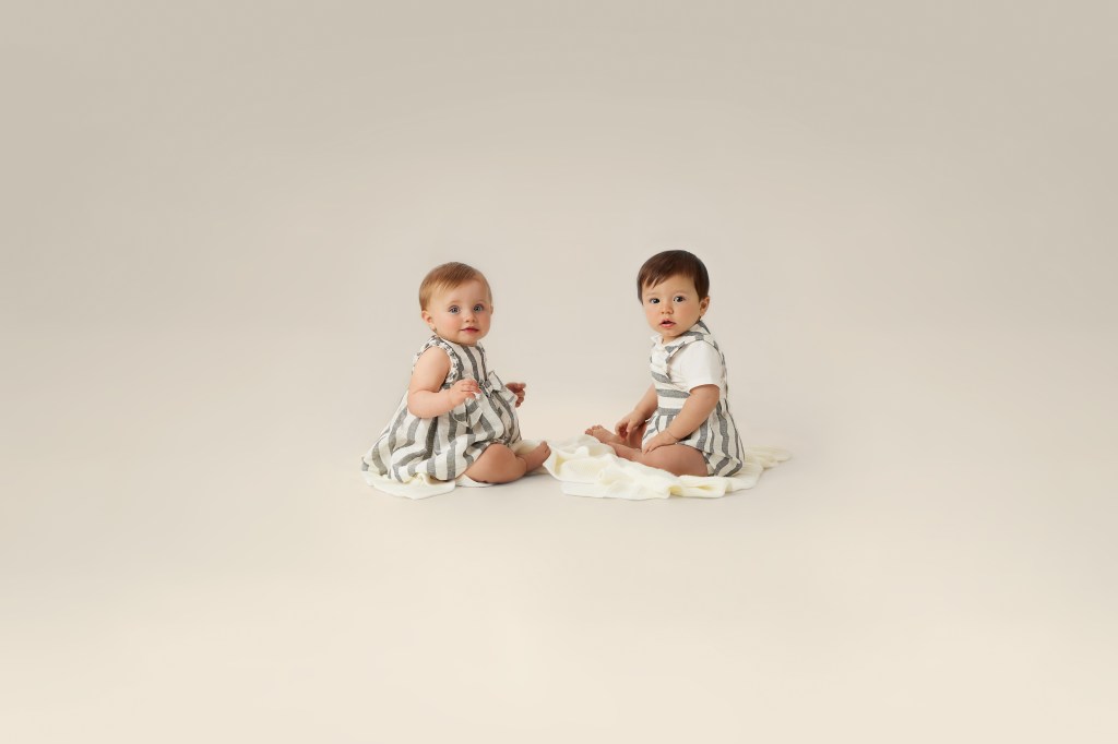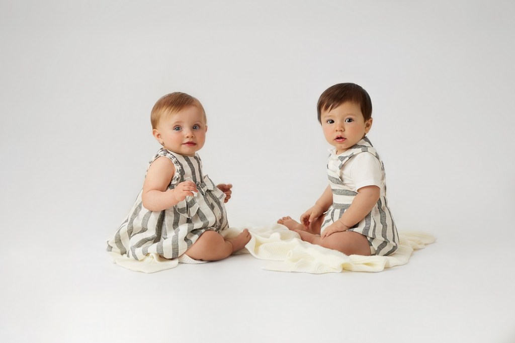 A righe panna e grigie, per il bimbo e la bimba, dà forma ad abitini, completi e pagliaccetti dal taglio elegante e dalle linee pulite.