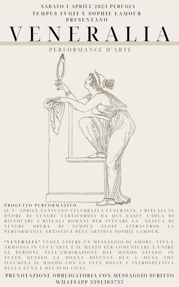 Il 1° aprile venivano celebrati i Veneralia, i rituali in onore di Venere Verticordia da qui nasce l’idea di rievocare i rituali romani per svelare la statua di Venere opera di Tempus Fugit attraverso la performance artistica di Sophie Lamour.