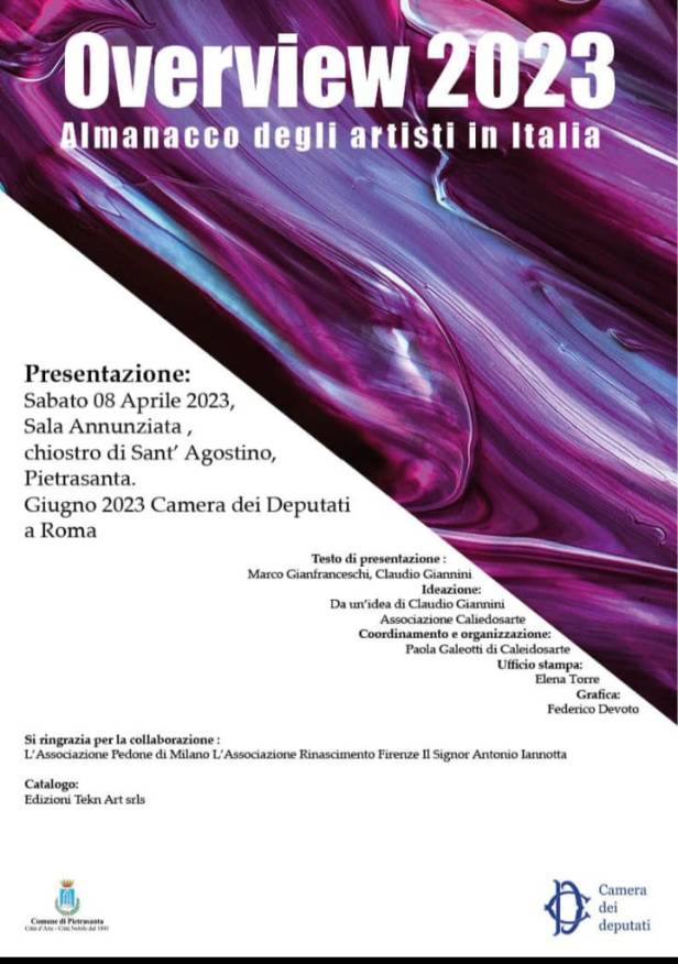 Overview 2023 Almanacco degli artisti in Italia Testo di presentazione: Marco Gianfranceschi, Claudio Giannini. Ideazione: Claudio Giannini, Associazione Caliedosarte Coordinamento e organizzazione: Paola Galeotti di Caleidosarte Grafica: Federico Devoto Prezzo: euro 25 Vendita: durante le presentazioni o ordinabile all’associazione scrivendo artepercorsi@gmail.com