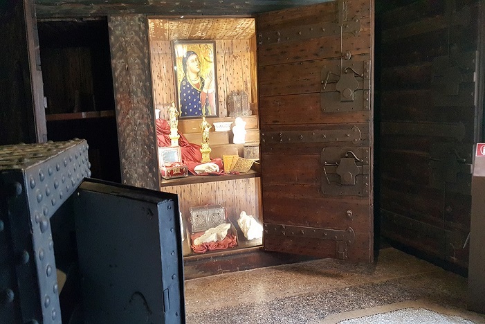 Si passa quindi alla Loggia Foscara dove un’anticamera allestita a zona di presidio introduce nella blindatissima Sala dei Forzieri, antichi custodi dei Tesori di Stato che presentano oggi al pubblico una selezione di preziosi manufatti legati alla storia della Serenissima, tutti provenienti dai depositi dei Musei Civici di Venezia e così valorizzati per la collettività.