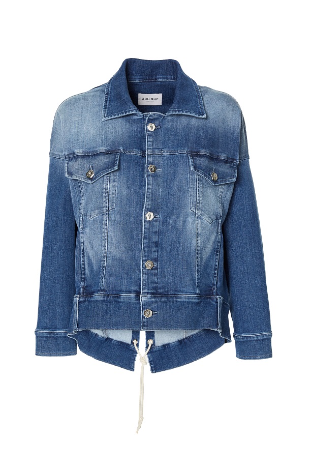 A partire dal classico giubbino dal taglio over interrotto, sulla schiena, da un’apertura chiusa da un intreccio in corda – da portare a pelle per un effetto sensuale oppure con il top bicolor dal caratteristico effetto sovrapposto– lo stesso che percorre la gamba del pantalone dal taglio regular con elastico in vita.