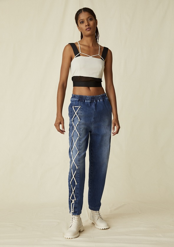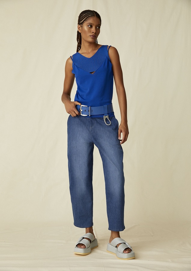 E ancora tendenza easy chic per il jeans essenziale e clean, da indossare con canotta basica spezzata dalla lavorazione a contrasto per un outfit a prova di street style.
