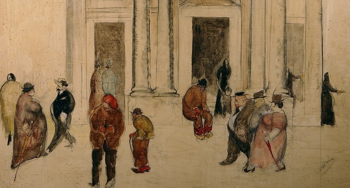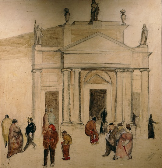 Realizzata con una tecnica decisamente singolare, l’opera trova probabilmente il suo soggetto principale nella chiesa stessa, un edificio storico della Viareggio antica, la “chiesa dei pescatori” che logicamente ricopriva un ruolo ben preciso nell’immaginario locale. In questo contesto Viani ambienta un canovaccio di quotidianità, in cui il bianco nitido della facciata fa da sfondo all’incontro di quell’umanità varia (i borghesi e il popolo appunto) che era spesso oggetto delle attenzioni dell’artista, qui raffigurati in uno spietato, caricaturale e quasi gustoso contrasto tra una pingue ricchezza e una malconcia povertà.