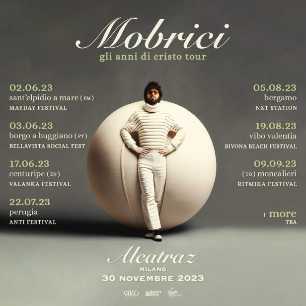 Dopo il successo delle due date primaverili che hanno registrato il tutto esaurito a Roma e Milano, Mobrici annuncia “GLI ANNI DI CRISTO TOUR”, la tournée estiva prodotta e organizzata da Vivo Concerti, in partenza da giugno 2023. Gli show vedranno Mobrici esibirsi in diversi festival italiani. Matteo Mobrici è un cantautore e vive a Milano. Nato batterista, passa ben presto a scrivere canzoni con una chitarra in mano all’età di 14 anni. È stato il frontman della band Canova, realtà di culto del panorama indie pop italiano. Da sempre spirito libero, autoironico ed inguaribile romantico, sensibile ai temi ecologisti, Mobrici è un multiforme cantautore sempre in bilico tra canzone d’autore e pop. Le sue sono storie minime per amori grandi, senza fronzoli e tanto suggestive, così autobiografiche da essere di tutti. “Gli Anni di Cristo”, il nuovo album di Mobrici, è uscito il 31 marzo 2023. L’album, scritto interamente all’età di 33 anni, è caratterizzato dalla capacità di Mobrici di dare voce alla sua generazione, con la semplicità di parole che spiazzano. Racconta di sé e riesce a veicolare senza difficoltà tutte le sensazioni, i sentimenti e gli interrogativi che assillano i tanti coetanei, in una storia che diventa condivisa. “Gli anni di Cristo” arriva dopo il primo album solista “Anche le scimmie cadono dagli alberi” pubblicato nel 2021, un lavoro che raccoglie undici pezzi di vita di Mobrici raccontati in musica.