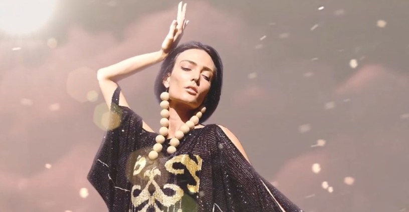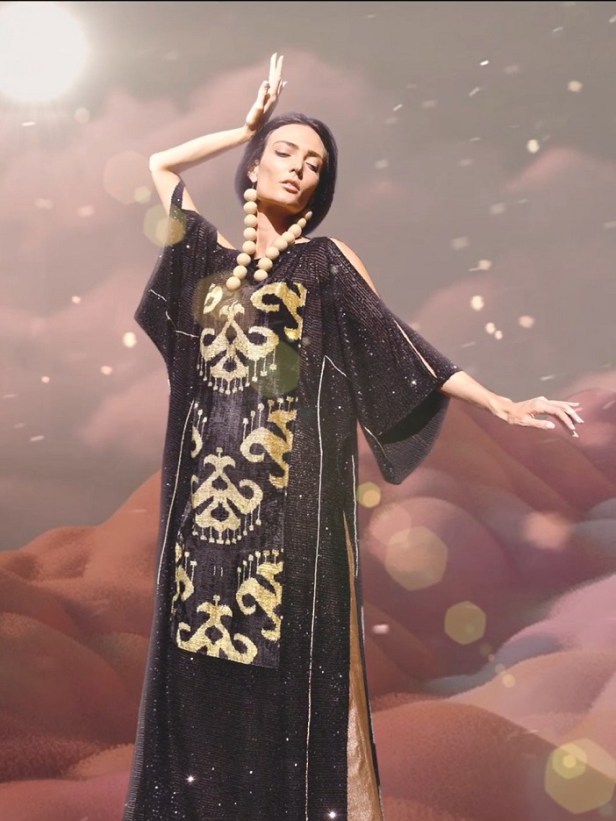 Pailletes nere e oro rappresentano il DNA del brand Cholpona che rispettano le tradizioni dei classici colori dell’Oriente usate nei secoli: il nero riflette una donna elegante, forte e sofisticata mentre l’oro indica salute, prosperità e sicurezza.
