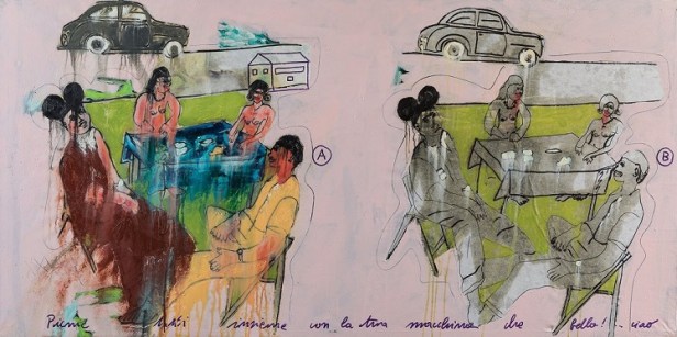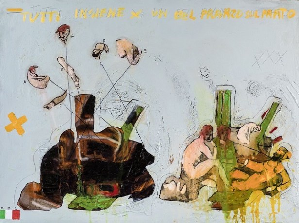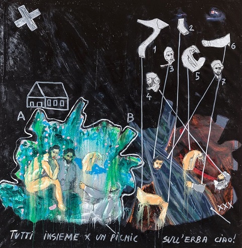 La sua narrazione per immagini si dipana in una sorta di laica via crucis, ispirata – talora deliberatamente, talvolta inconsciamente – a opere di grandi artisti del passato, dalla figura ieratica di San Sebastiano, che rimanda alla pittura rinascimentale di Antonello e Mantegna, alla leonardesca “Gioconda”, con il volto celato in parte dalla mascherina, fino all’“Amor sacro e Amor profano” di Tiziano. E poi molteplici variazioni del “Déjeuner sur l’herbe”, tema caro alla pittura francese impressionista, evocato nelle declinazioni di Monet e Renoir.