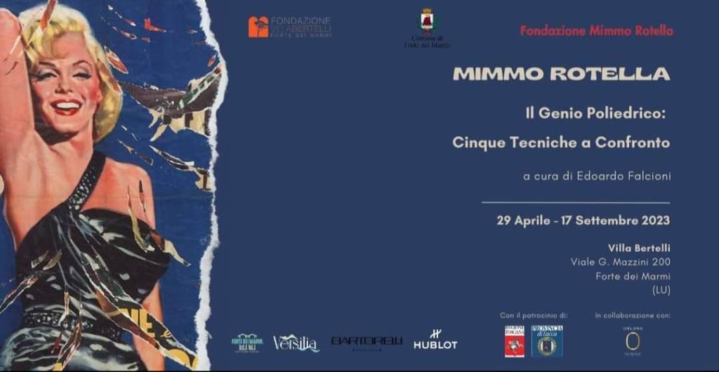 MIMMO ROTELLA IL GENIO POLIEDRICO è curata da Edoardo Falcioni, promossa da Villa Bertelli, Comune di Forte dei Marmi, Fondazione Mimmo Rotella e coprodotta con Oblong Contemporary Art Gallery di Dubai e Forte dei Marmi. La rassegna è sotto il Patrocinio di Regione Toscana e Provincia di Lucca, ed è sponsorizzata da Hublot, Bartorelli Gioiellerie, Ciaccio Arte – Broker Insurance Group.