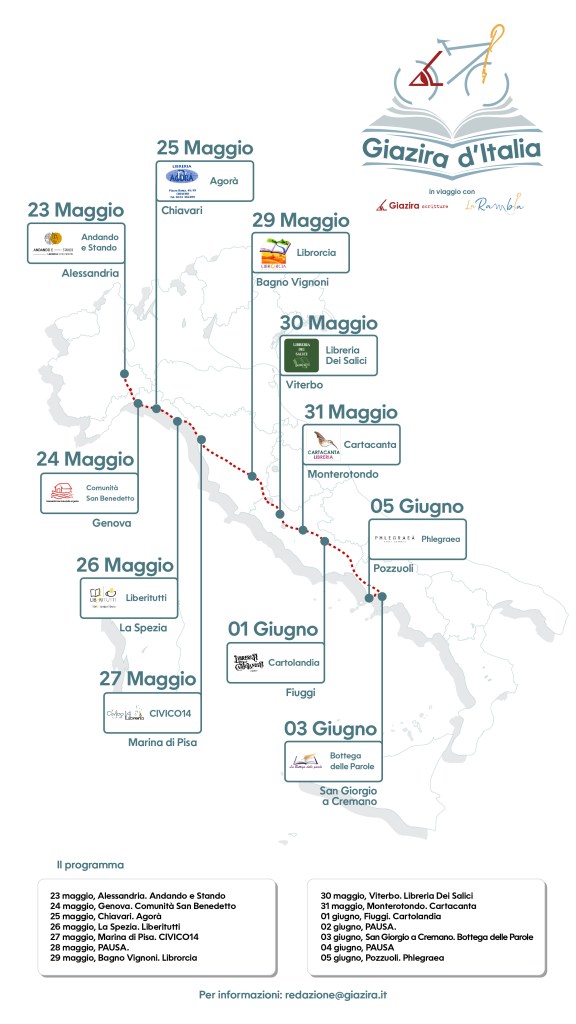 Si parte il 23 maggio da Alessandria (tappa presso Andando e Stando – Libreria con Mescita), per poi proseguire il 24 maggio alla Comunità San Benedetto al Porto di Genova, il 25 maggio nella Libreria Agorà di Chiavari (Ge), il 26 maggio nella Libreria LIBeRITUTTI di La Spezia e il 27 maggio nella Libreria Civico 14 di Marina di Pisa.