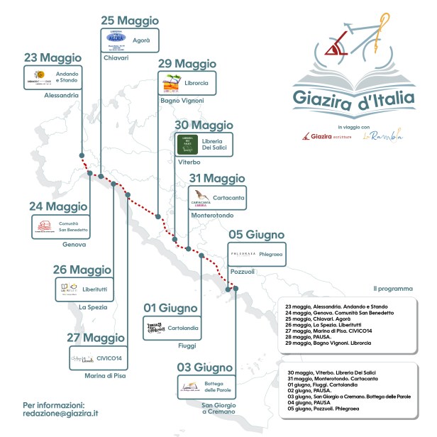 Dopo il successo dello scorso anno la nuova edizione dell’iniziativa che vedrà l’editore di Giazira scritture, appassionato ciclista, ad attraversare Piemonte, Liguria, Toscana, Lazio e Campania. Su Vimeo il documentario della scorsa edizione.