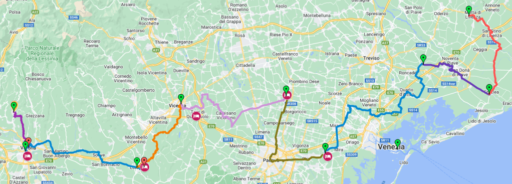 Nel dettaglio, il percorso prevede 8 tappe in 8 giorni: centinaia di chilometri dal Veneto occidentale al Veneto orientale in città e borghi di grande bellezza. Tra gli altri, dopo la partenza a Negrar, il gruppo toccherà Verona, attraversando l’Adige sul magnifico Ponte Pietra, le risorgive di Montorio mantenendosi a nord dell’Adige fino a Soave, borgo più bello d’Italia, poi tappa a Lonigo, famoso centro agricolo per la produzione del riso e del pisello nano,Vicenza, Poiana di Granfion, Camposampiero, luogo antesignano legato al Sant’Antonio da Padova, il Santuario Antoniano dell’Arcella, Dolo, Martellago e poi Monastier di Treviso, entrando di fatto nel territorio del Prosecco, San Donà di Piave, Eraclea, perla dell’Adriatico per il suo paesaggio verdeggiante. Nell’ultima tappa verso Motta di Livenza alcuni vecchi e nuovi ospiti dell’Ospedale riabilitativo in alta specializzazione cammineranno con il gruppo e lo accoglieranno presso la loro struttura, dove gli 8 riders racconteranno i loro straordinari giorni di Cammino.