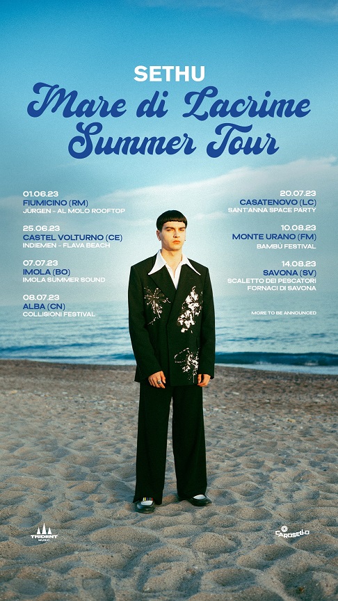 Dopo la partecipazione in gara tra i Big del 73esimo Festival di Sanremo, Sethu fa il suo ritorno con la hit estiva più “triste” dell’anno: fuori ovunque il nuovo singolo e il video di “Mare di Lacrime” (Carosello Records) che riprendono i canoni estetici e musicali dei tormentoni estivi per farne qualcosa di nuovo, stravagante, mischiando la salsedine del mare con quella delle lacrime. Un Sethu più leggero ma fedele a sé stesso, capace di sorprendere con un brano che anticipa sin dal suo titolo un curioso connubio tra l’immaginario ironico e dark dell’artista con quello solare e distensivo dell’estate.
