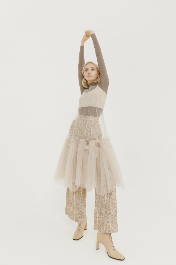 La stilista vuole ricordare quanto sia facile, tra i tanti sentieri percorribili, perdersi, dimenticarsi del traguardo o abbandonarsi al pensiero dell’irrealizzabilità del tragitto. I capi sono stati realizzati con un’accurata ricerca di materiali e tessuti.