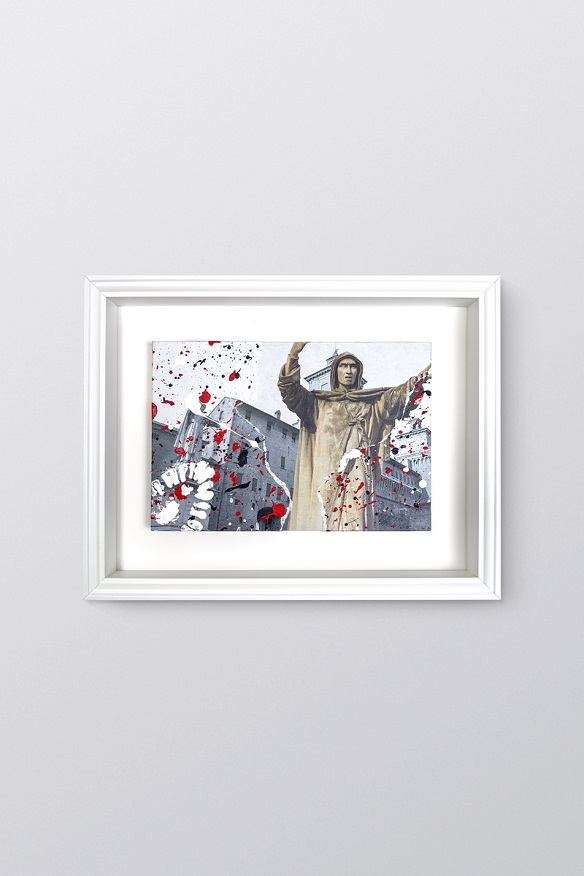 L’applicazione di oggetti di uso comune che abitualmente vengono abbandonati come residui di un consumismo becero completa il messaggio in chiave pop anni Sessata.