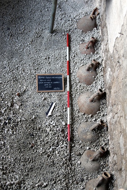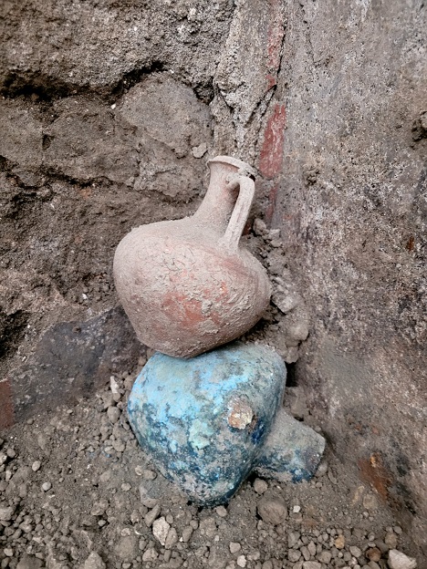 Nella stanza in cui giacevano i corpi sono emersi anche alcuni oggetti, quali un’anfora verticale appoggiata alla parete nell’angolo vicino a uno dei corpi e una collezione di vasi, ciotole e brocche accatastata contro la parete di fondo. La cosa più impressionante è l’evidenza dei danni subiti da due pareti, probabilmente, a causa dei terremoti che hanno accompagnato l’eruzione.