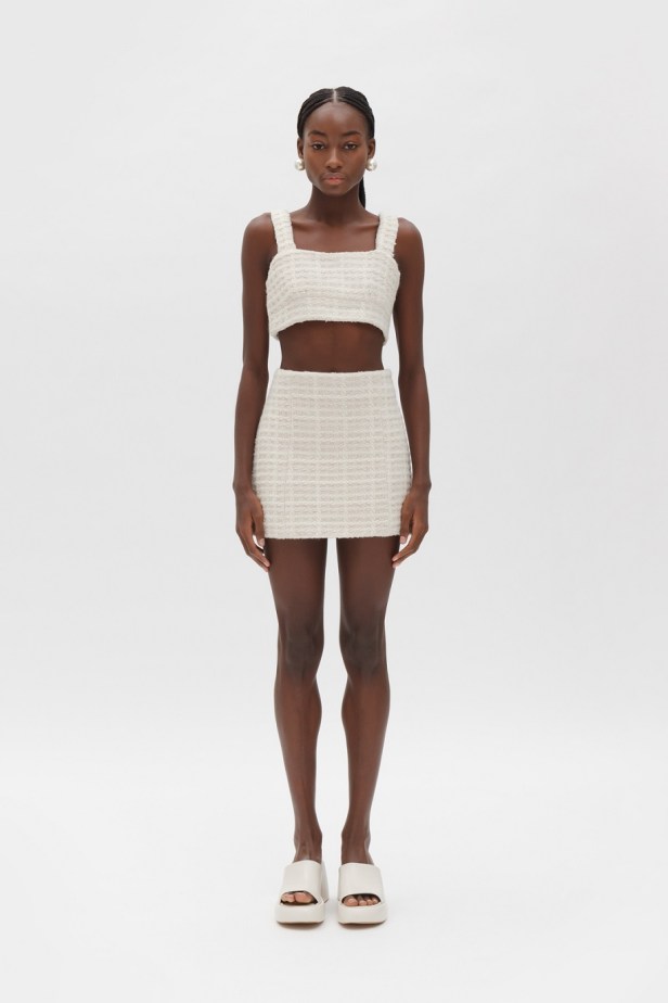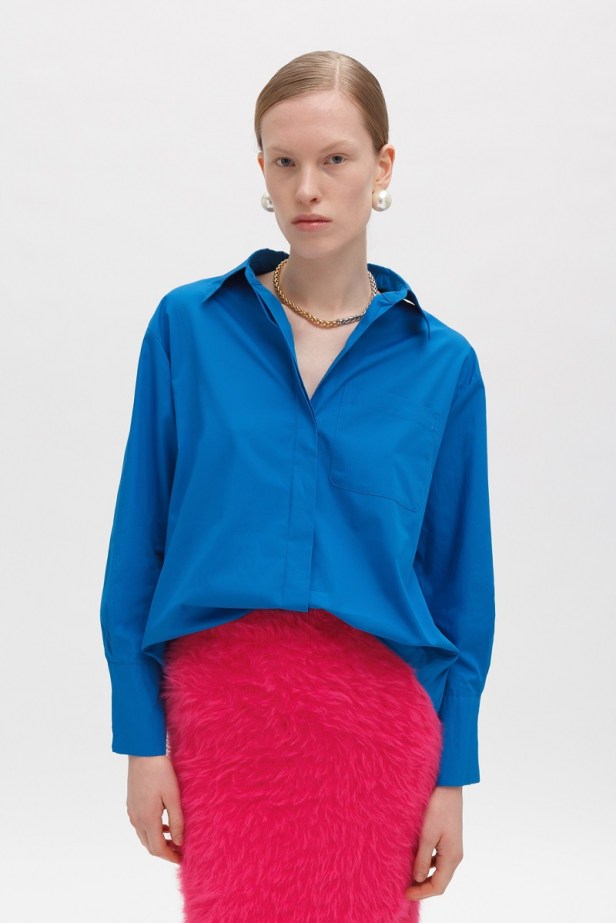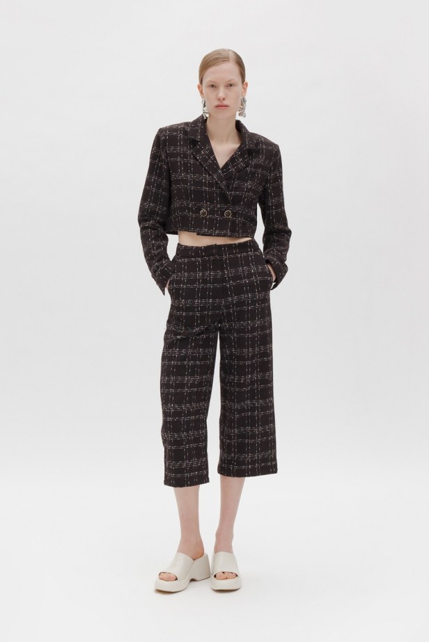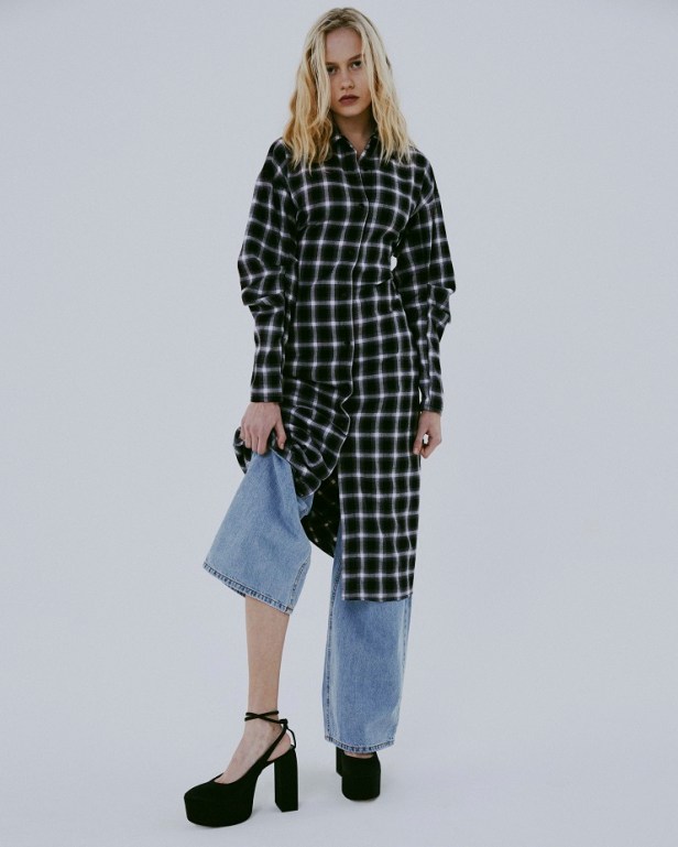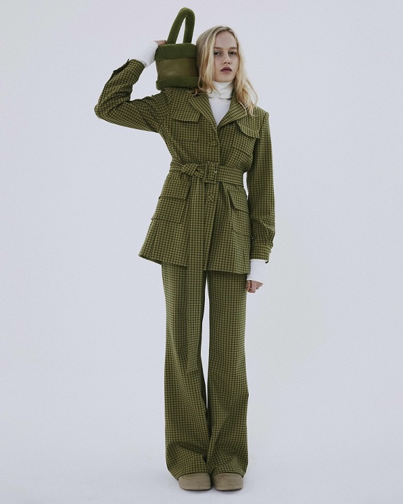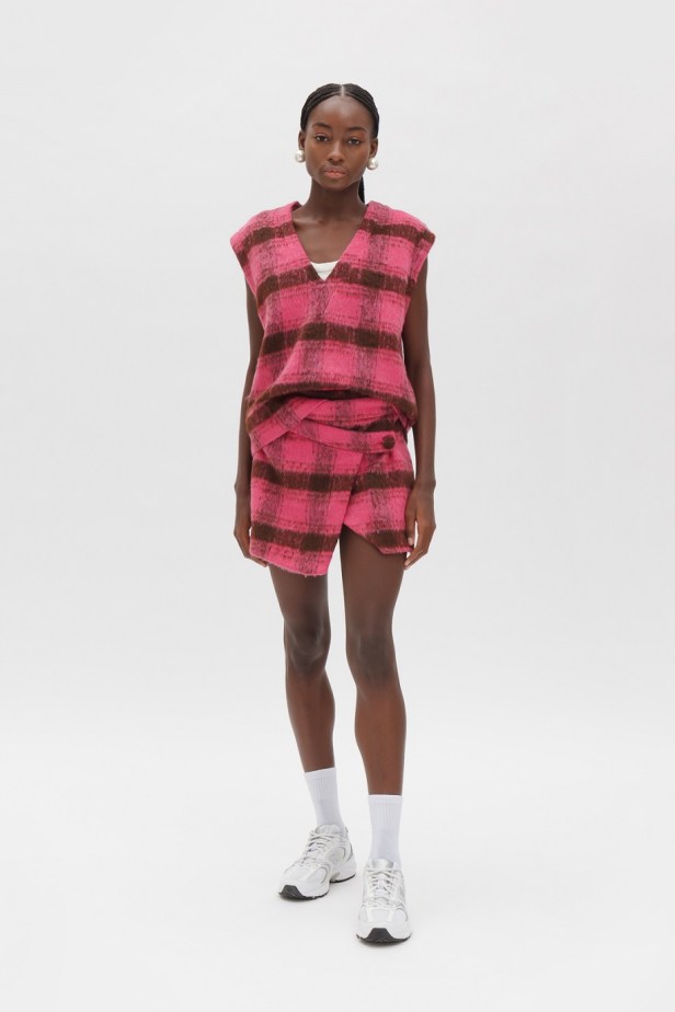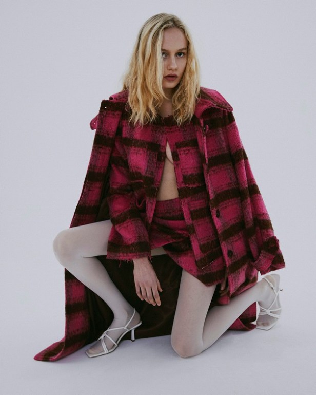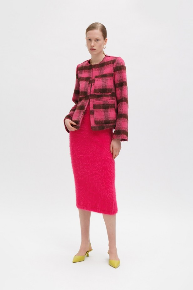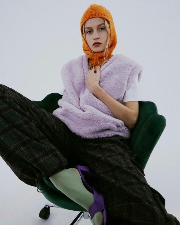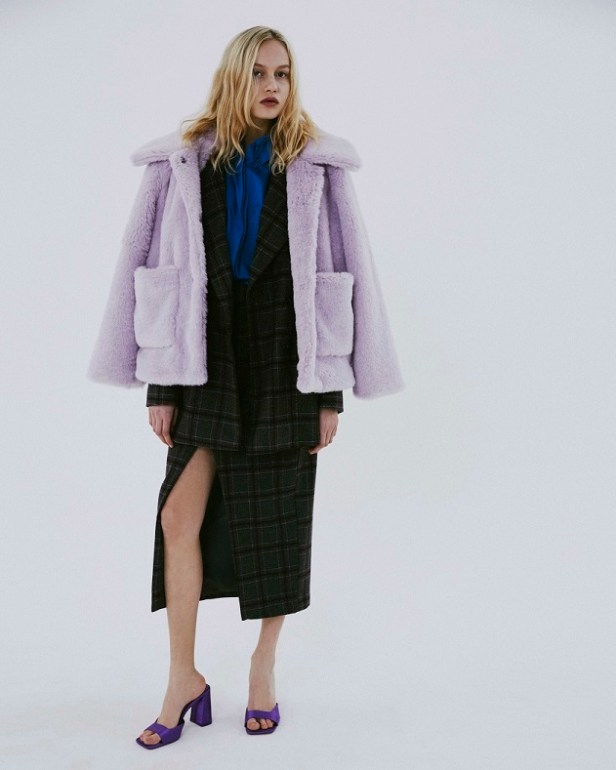 Le tonalità fredde e neutre che contraddistinguono quasi totalmente la collezione sono gradevolmente contrastate da quelle vivaci del tessuto a quadri fucsia del completo giacca/gonna, dal verde acceso della camicia oversized e dal lilla del gilet in pelliccia ecologica.