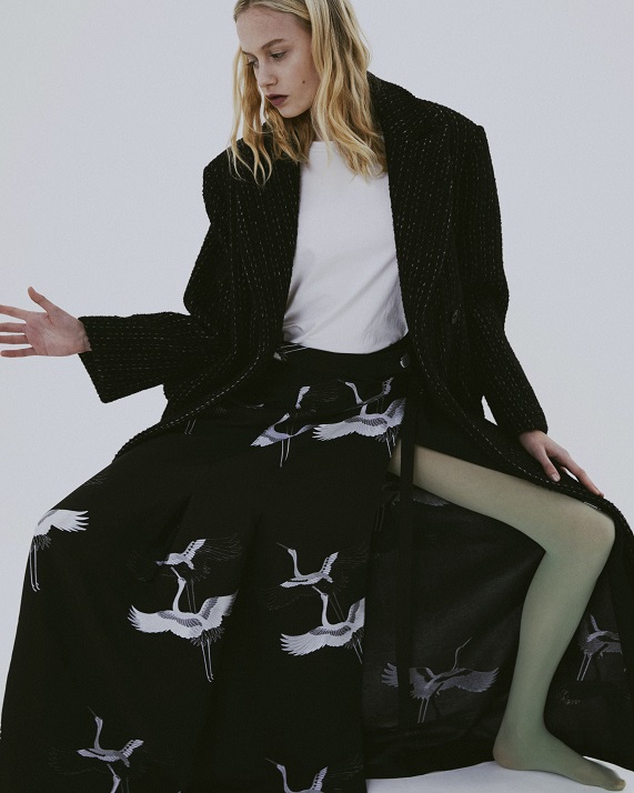 A caratterizzare la FW_23/24 di Weili Zheng il tessuto a stampa aironi cenerini, le maxi spalle delle giacche e dei gilet, il super oversized di alcuni pezzi, le cinture strette ad enfatizzare il punto vita sui capi dal taglio più maschile e il total look zebrato.