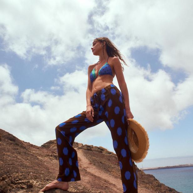 Dal costume al fuori acqua, l’imperativo è brillare! Dalle luci dell’alba fino al tramonto, con long dress multicolor e pants palazzo, heritage dei seventies più glam.