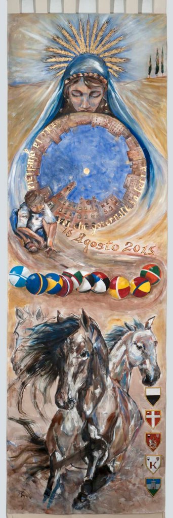 Il drappellone realizzato dall’Artista non solo traduce pittoricamente la dedica: “terra di Siena, terra del mondo”, ma riesce a coniugare, perfettamente, gli elementi inscindibili della grande festa senese: gioco e ritualità, sacralità e umanità. Il 10 agosto, finalmente viene svelato il Drappellone, dipinto anche con il vino del territorio senese, davanti al Sindaco, alla Giunta Comunale, alla stampa e ai media: i simboli delle 10 contrade, i berberi, usati come biglie da un bambino, Siena sullo sfondo e soprattutto l’immagine di Maria, Assunta in cielo, tenera e protettiva, ma soprattutto immagine emblematica di donna, una immagine dove si indovina la sensibilità tipica dei grandi affreschi di ispirazione religiosa e un’identità femminile forte e orgogliosa che evoca il concetto atavico di Madre Terra oltre ai contenuti allegorici che richiamano uno dei tratti più tipici e universalmente riconosciuti dell’identità territoriale senese, la produzione agroalimentare e del secolare legame tra la città e le sue campagne, e il riconoscimento del ruolo delle donne nell’alimentazione mondiale.