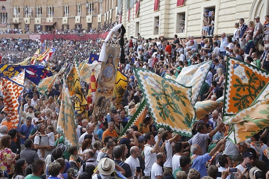 Anno dell’Expo, il 2015, Elisabetta Rogai ricorda quel giorno, la bocca asciutta dall’emozione, la corsa pazza dei cavalli durata un attimo, ma le immagini sono rimaste ancora nei suoi ricordi fatti di colori, urla, gente che piange e si abbraccia, cavalli pazzi e frementi, il suo Drappellone di tessuto di seta tirato da mille mani, conquistato e poi esposto sul carro trascinato dai buoi, mostrato lentamente nel giro della piazza dalla terra rossa per poi finire in Chiesa, come una testimonianza sacra.