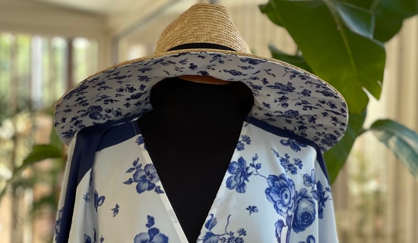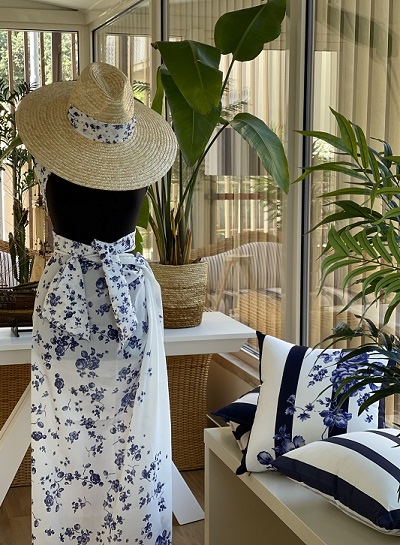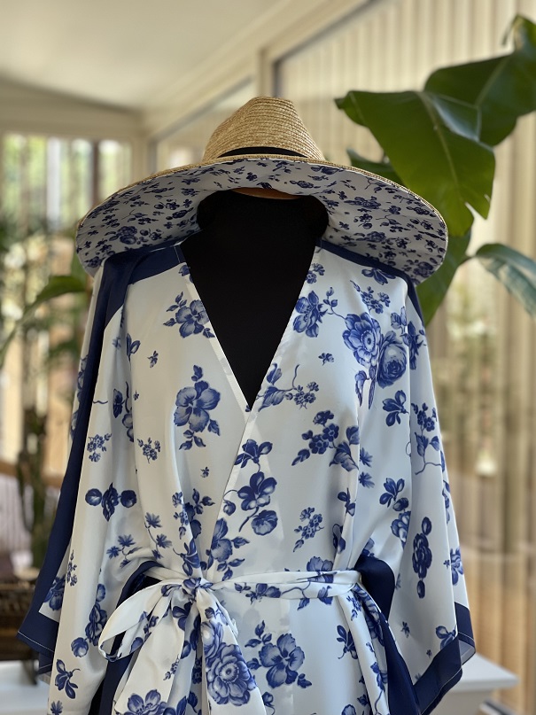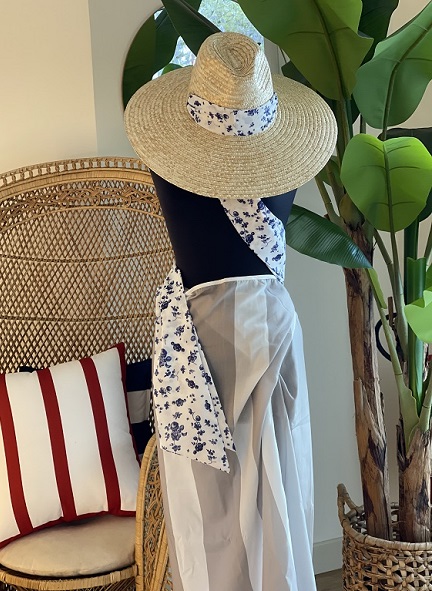 La Capsule propone cappelli in paglia naturale personalizzati con nastri in stampa floreale, abbinati a kimono in pura seta e pareo che riprendono i colori del mare.