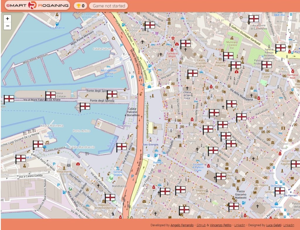 La mappa di gioco è suddivisa in CheckPoint corrispondenti a luoghi di interesse storico, culturale o paesaggistico. A ciascun CheckPoint è assegnato un punteggio numerico ed una scena, ossia un’azione da compiere (ad esempio scattare una fotografia in una determinata posa). Ogni squadra poi potrà partire da qualsiasi punto dal comune di Genova creandosi la propria strategia di gioco.