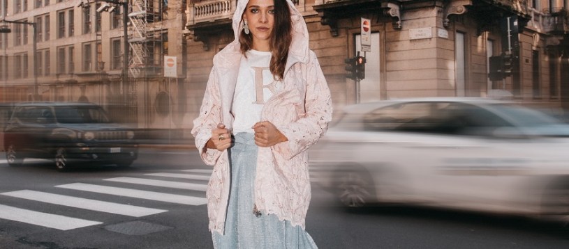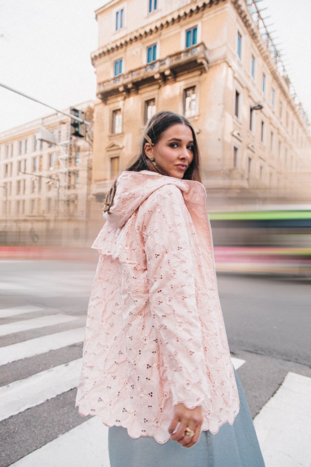 Rosa, ma disponibile anche in azzurro e cammello, ha un ampio cappuccio e un’arricciatura in vita che gli permette di cambiare stile in un secondo e di fare un figurone sia su jeans sia su gonne vaporose.