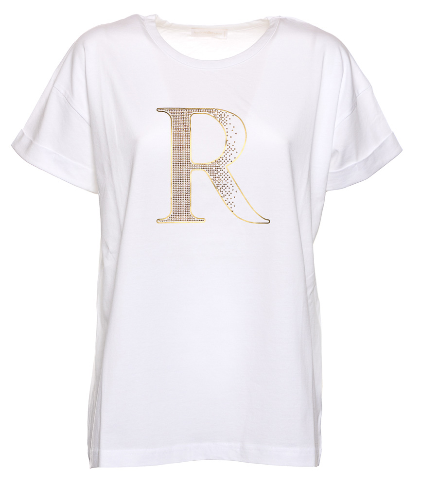 La T-shirt basic ma con piglio rock scende dritta a coprire i fianchi ma senza segnare ed è freschissima: in puro cotone, ha spalla scesa, manica con risvolto e una stampa logo sottolineata da micro borchie color oro.