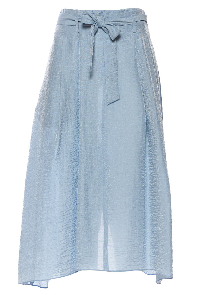 ROCCO RAGNI la abbina a una gonna svasata in un brillante tessuto misto viscosa, principesca ma a tutto comfort, con vita alta e fusciacca da annodare.