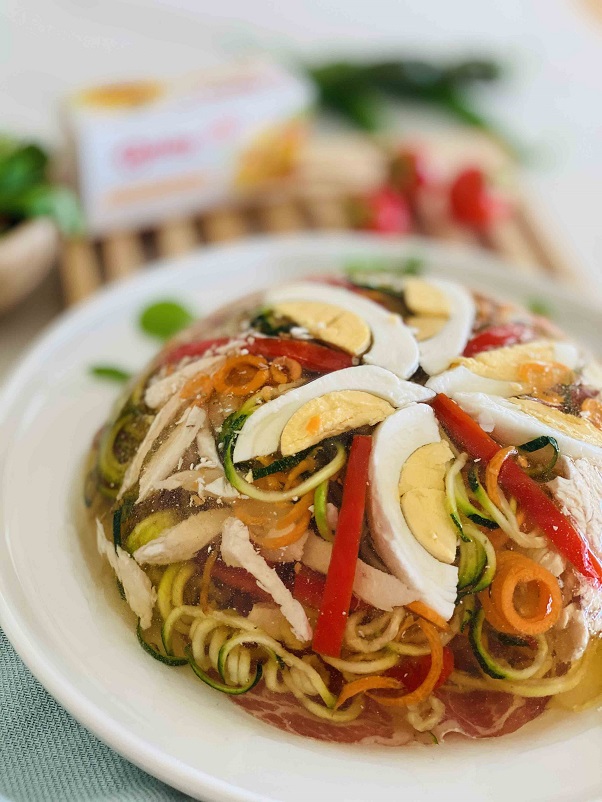 La foodblogger Anna ha realizzato un aspic a base di pollo, uovo e verdure e per renderlo ancora più invitante ha utilizzato il Preparato per Gelatina Bauer.