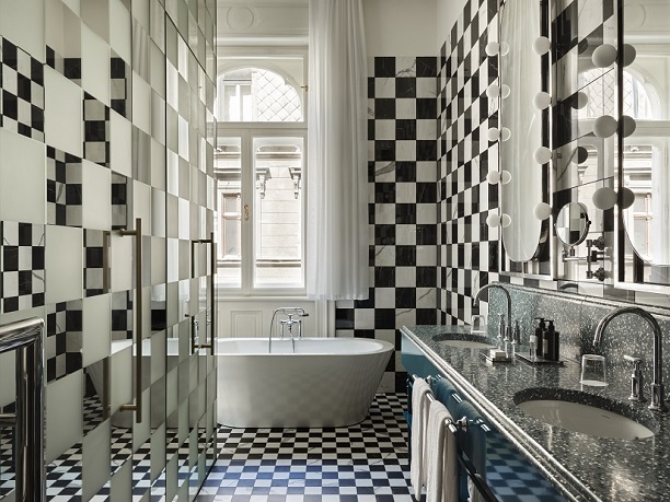 Budapest offre una serie di attività che combinano tradizioni e nuove tendenze per creare una scena sociale vibrante ed eclettica. In particolare, l’hotel riflette l’amore della città per gli scacchi attraverso il suo design ispirato al “Budapest Gambit“. I motivi delle scacchiere compaiono ripetutamente, nel pavimento in marmo piastrellato monocromatico, nello specchio della W Lounge ispirato ad una scacchiera, ma anche nelle camere con pareti e nicchie piastrellate in bianco e nero e nelle lampade che emulano i pezzi degli scacchi . A ciò si aggiunge l’omaggio alla tradizione dei bar di Budapest, e le zone pranzo del Nightingale, il destination restaurant dell’hotel, che mescolano i toni del blu con arredi tipici dei caffè per creare un senso di intimità.