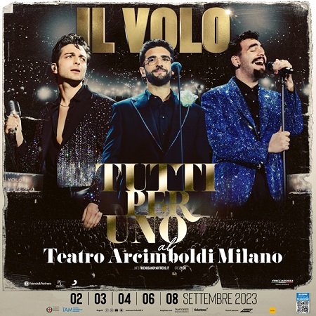 In seguito al grande successo del concerto dall’Arena di Verona trasmesso su Canale 5 “Tutti per uno”, che ha vinto lo share della prima serata, IL VOLO ripropone il grande show in 5 esclusive date al Teatro Arcimboldi Milano, il 2, 3, 4, 6 e 8 settembre! È la prima volta che Il Volo si esibisce in un teatro in Italia, instaurando così un legame speciale con il pubblico in un’atmosfera più intima. “Tutti per uno” è uno show che creerà un’armonia magica trasportando gli spettatori in un viaggio indimenticabile. Sul palco, Piero, Ignazio e Gianluca, accompagnati dall’Orchestra, oltre ad esibirsi nei loro classici ormai entrati nei cuori dei fan, si alterneranno regalando al pubblico le loro voci soliste. Tra i brani in scaletta non mancheranno “Ecstasy Of Gold”, dal loro ultimo album “Il Volo Sings Morricone”, la loro hit “Grande amore” e i classici della canzone popolare come “‘O Sole Mio” e “Il Mondo” e dell’opera come “Nessun dorma” e “Libiamo ne’ Lieti Calici”. Scherzando tra di loro e raccontando aneddoti legati alla loro carriera, daranno vita ad un’atmosfera di familiarità che avvolgerà tutto il teatro. Le prevendite sono disponibili su Ticketone e nei circuiti di prevendita abituali. Ulteriori informazioni su: www.friendsandpartners.it . FRECCIAROSSA è Treno Ufficiale dei concerti de Il Volo al Teatro Arcimboldi Milano.