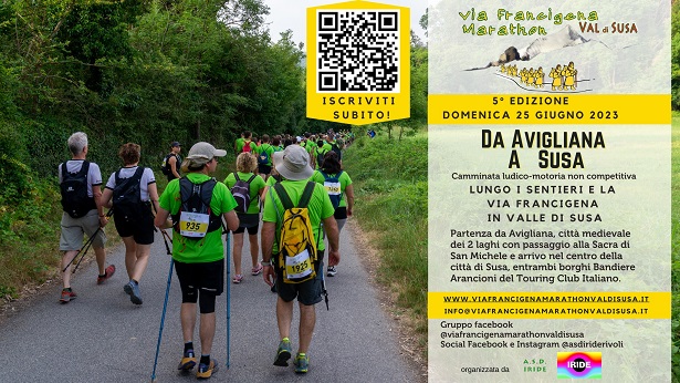 È fissato per domenica 25 giugno l’appuntamento podistico con la Francigena Marathon Val di Susa, camminata ludico-motoria non competitiva organizzata dall’associazione sportiva Iride di Rivoli.