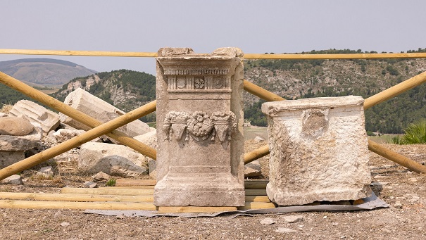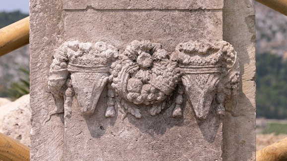Seppellito per secoli da pochi centimetri di terra e dalla vegetazione, nell’area dell’acropoli Sud, il manufatto è composto da due raffinati elementi lapidei scolpiti ed è in perfetto stato di conservazione.