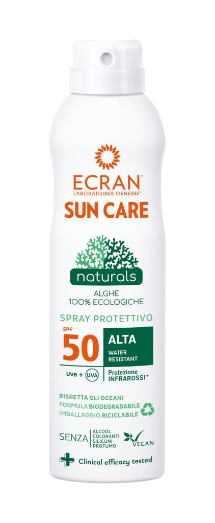 Tra i prodotti di punta per l’estate 2023 Ecran propone lo spray protettivo Naturals SPF50 – 250 ml una nuova formula sviluppata con filtri solari accuratamente selezionati per ridurre al minimo l’impatto ambientale e proteggere la pelle in modo naturale, con estratto di alghe 100% ecologiche, senza alcool, coloranti, siliconi e profumi. La sua texture leggera favorisce un rapido assorbimento ed è resistente all’acqua, oltre a risultare comodo e pratico col suo erogatore a diffusione continua. Come gli altri solari Ecran, grazie alla formula Cellular Defense® protegge dagli effetti negativi causati dall’esposizione ai raggi solari e infrarossi e attiva le difese naturali della pelle, prevenendone l’invecchiamento prematuro.